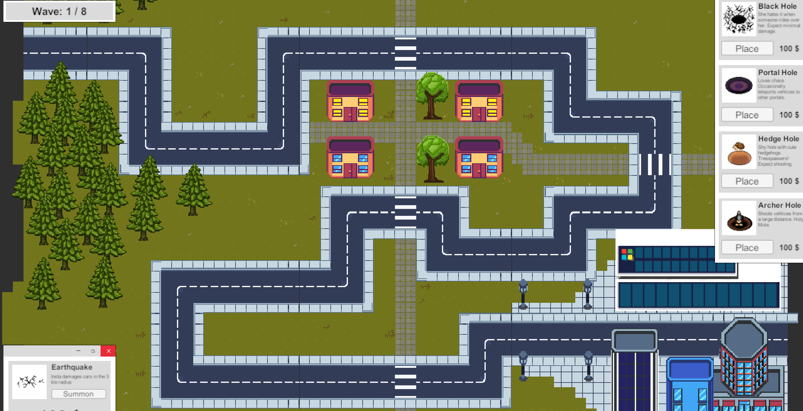 To place a hole. Click on Place button on the menu in the top-right corner. Then drag hole on the road (it's not possible to place holes off the road) and click Left Mouse button